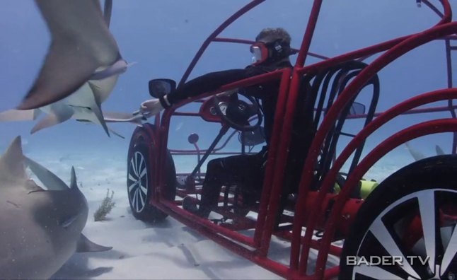 „Volkswagen Beetle“ ryklių narvas važiuoja po vandeniu – vaizdo įrašas